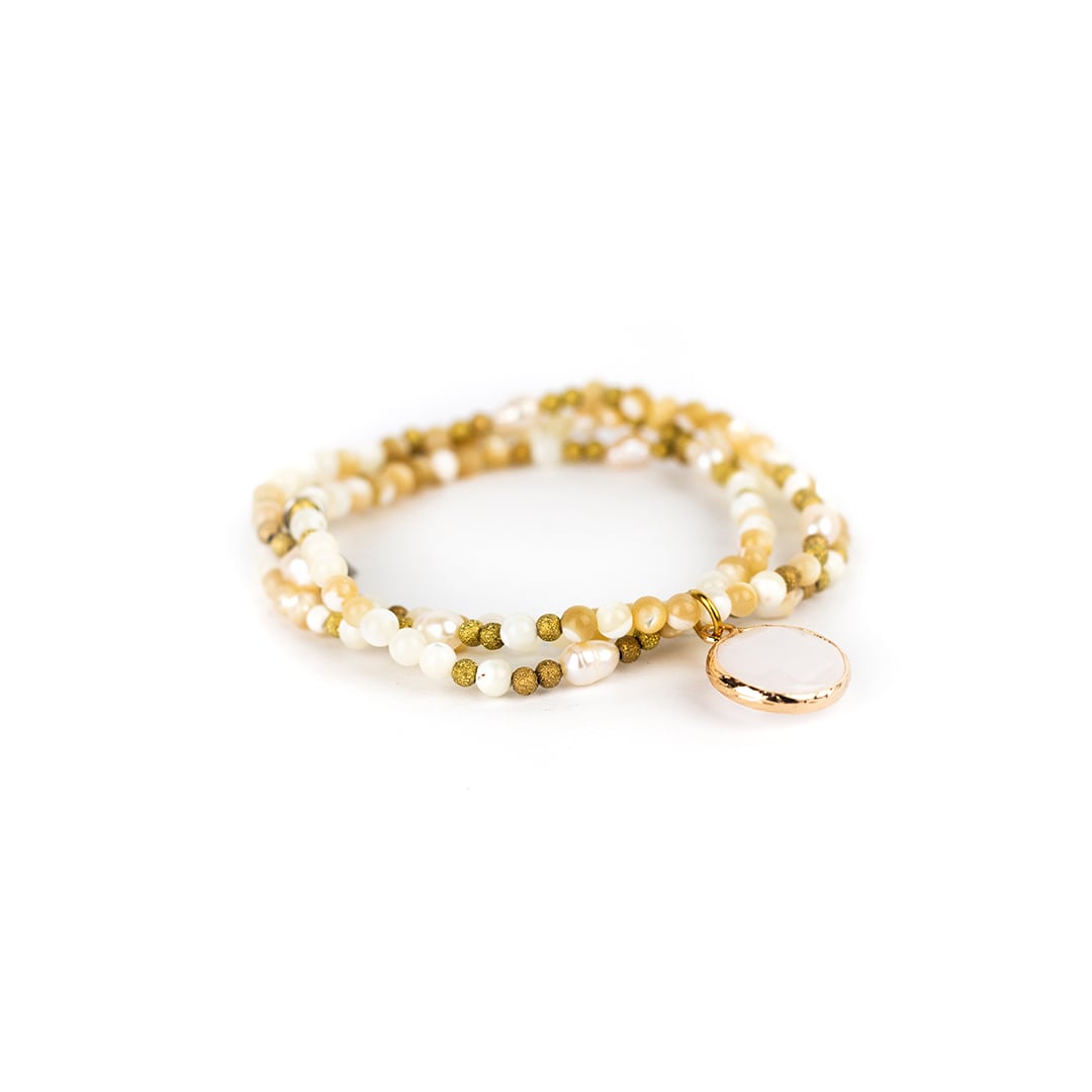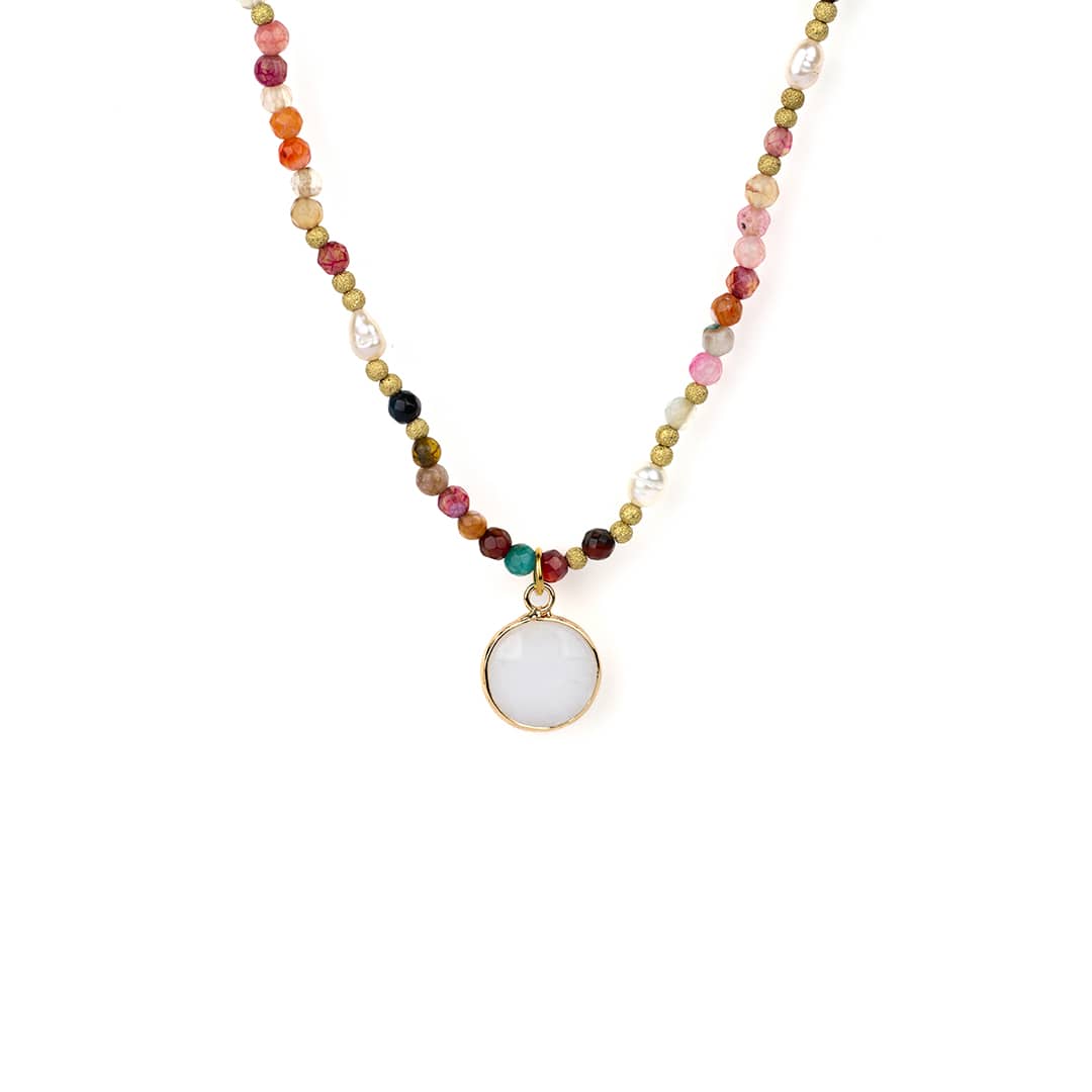 Farbig schimmernde Edelsteine mit feiner Facettierung reihen sich an unser Armband ‘Ani’ mit zarten goldfarbenen Kügelchen und einzelnen Zuchtperlen aneinander – ein wirklich edles Ensemble, das durch einen in gold gefassten Edelstein ergänzt wird. Mit diesem Accessoire setzt du ein Statement, das jeden Look veredelt.