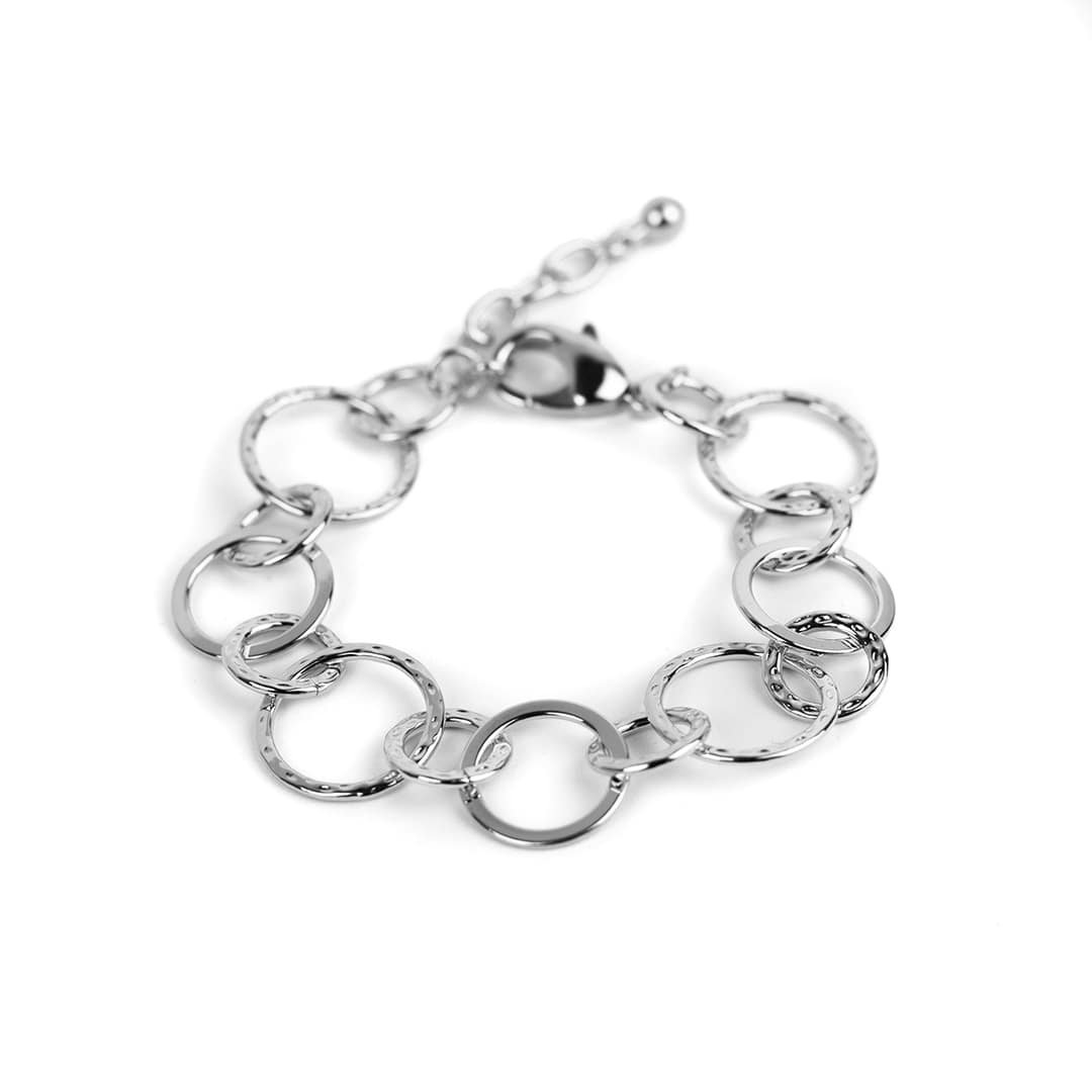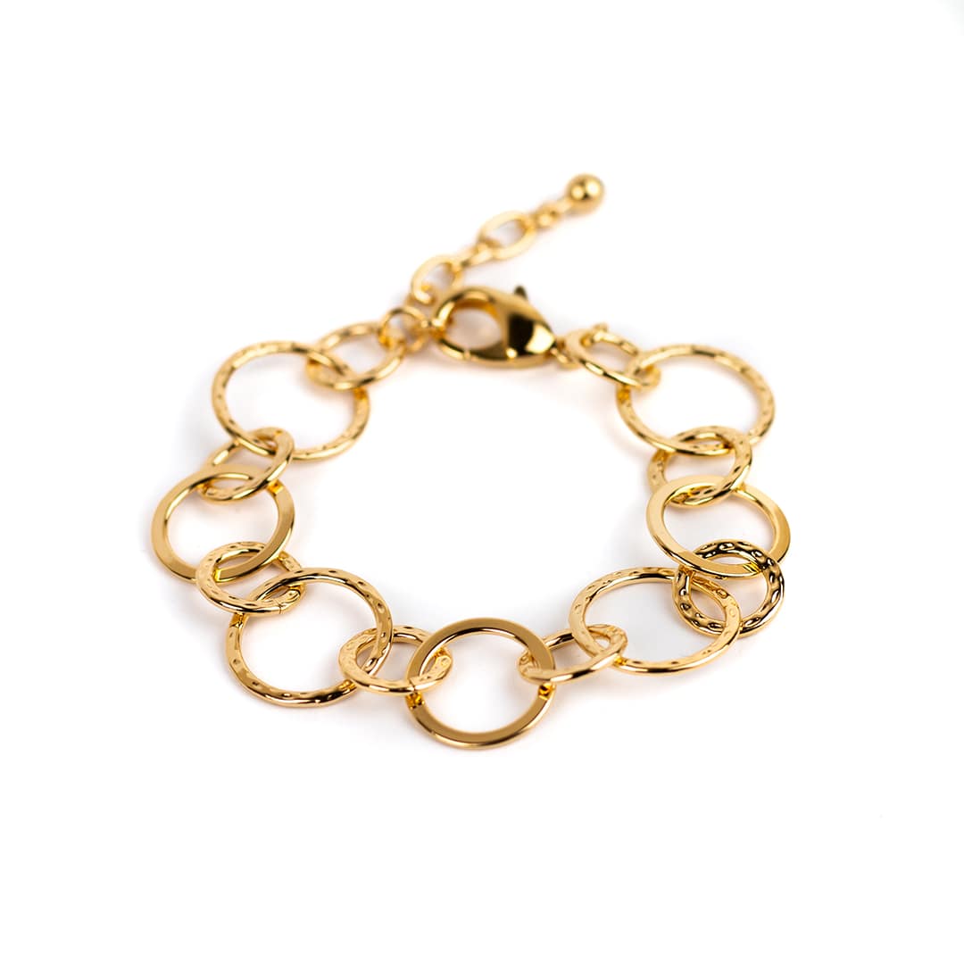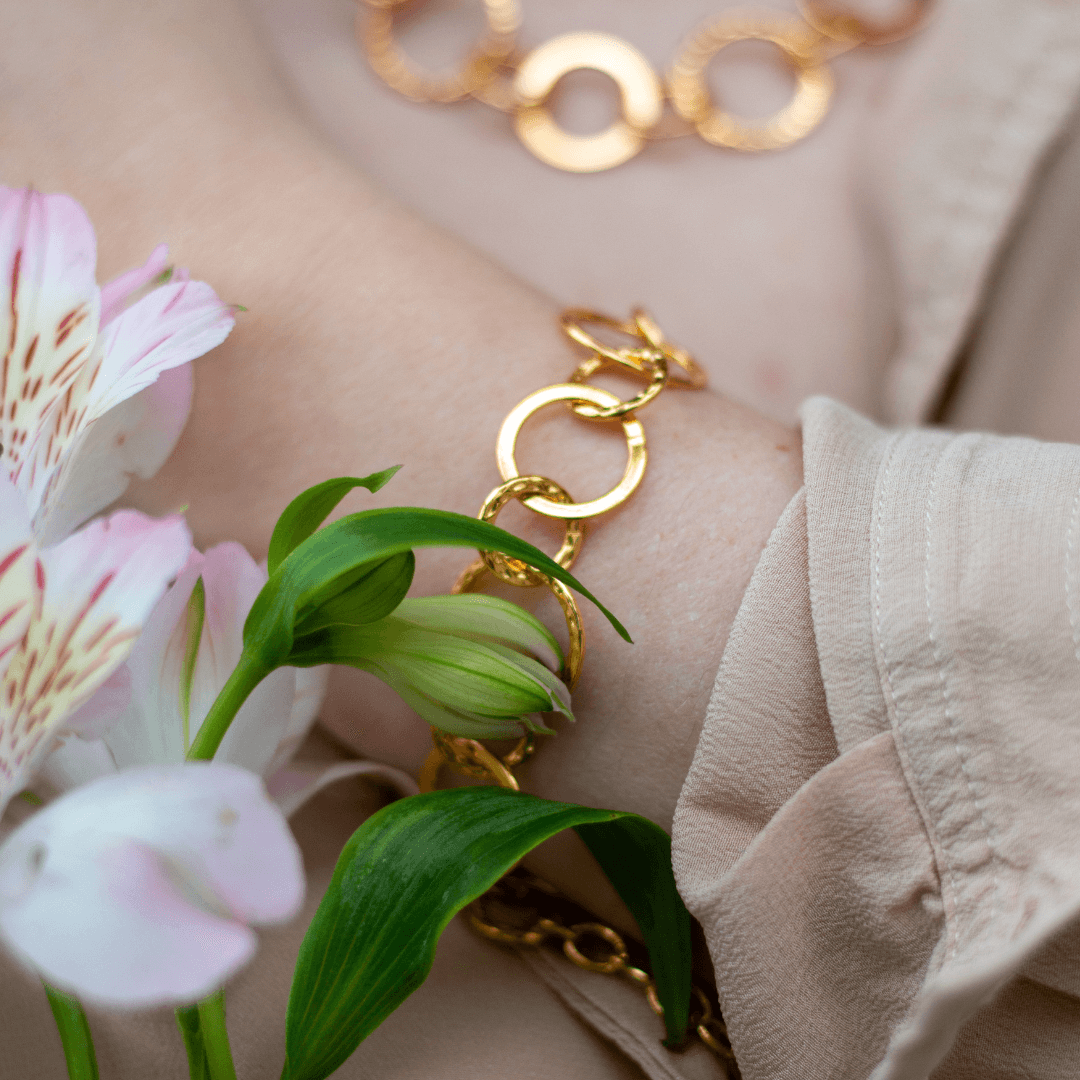 Verschieden große Kreisrunde Kettenglieder aus Schmuckmessing reihen sich bei ‚Mari‘ aneinander. ‚Mari‘ ist perfekt als Key-Piece und unschlagbar in Kombination mit anderen Schmuckstücken. Eben ein toller Hingucker, ob zur Jeans oder zum Abendkleid. Dank des großen Karabinerverschlusses lässt sich das Schmuckstück in jeder beliebigen Länge bis maximal 22 cm tragen und auf deine Wunschlänge einstellen.