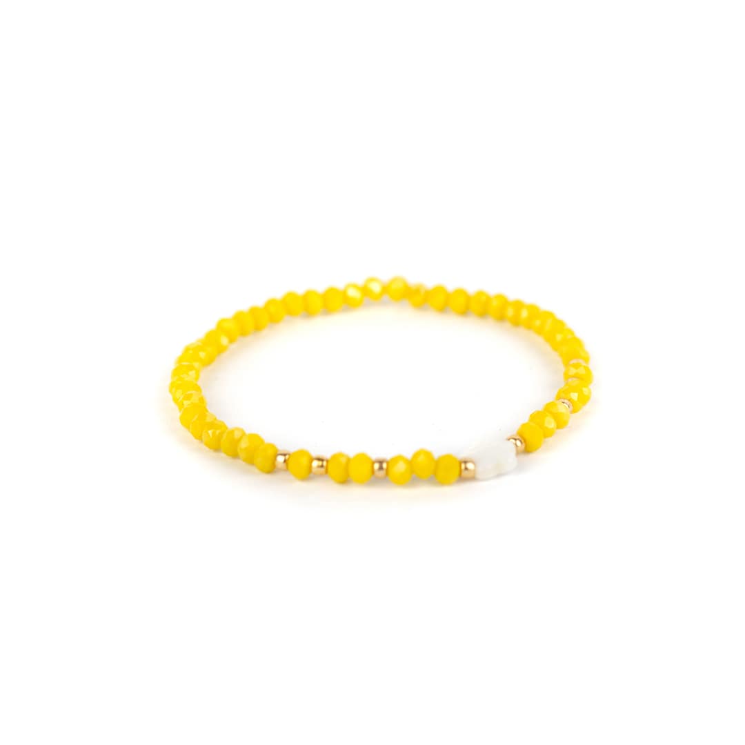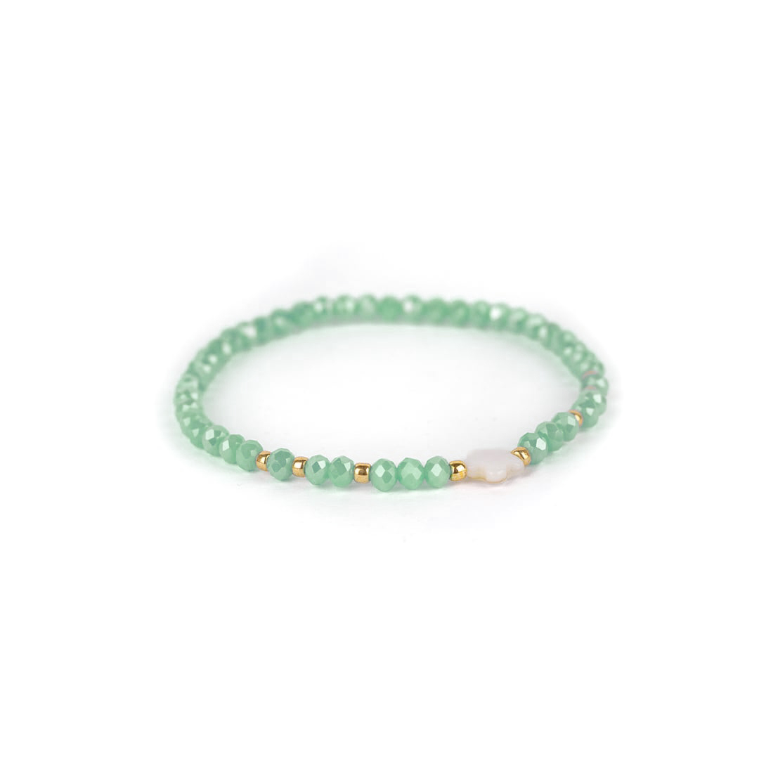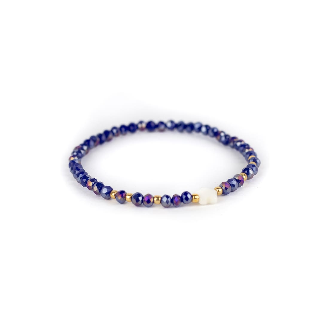‘Noi’ versprüht einfach gute Laune und eignet sich ganz besonders als Freundschaftsarmband. Zarte Kristalle reihen sich mit filigranen Goldkügelchen an ein Stretcharmband.