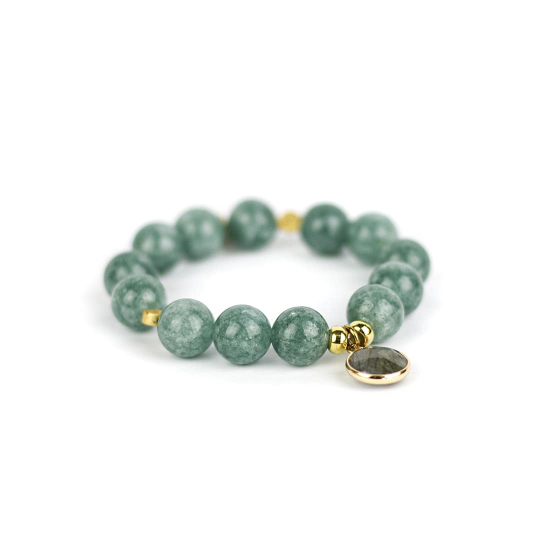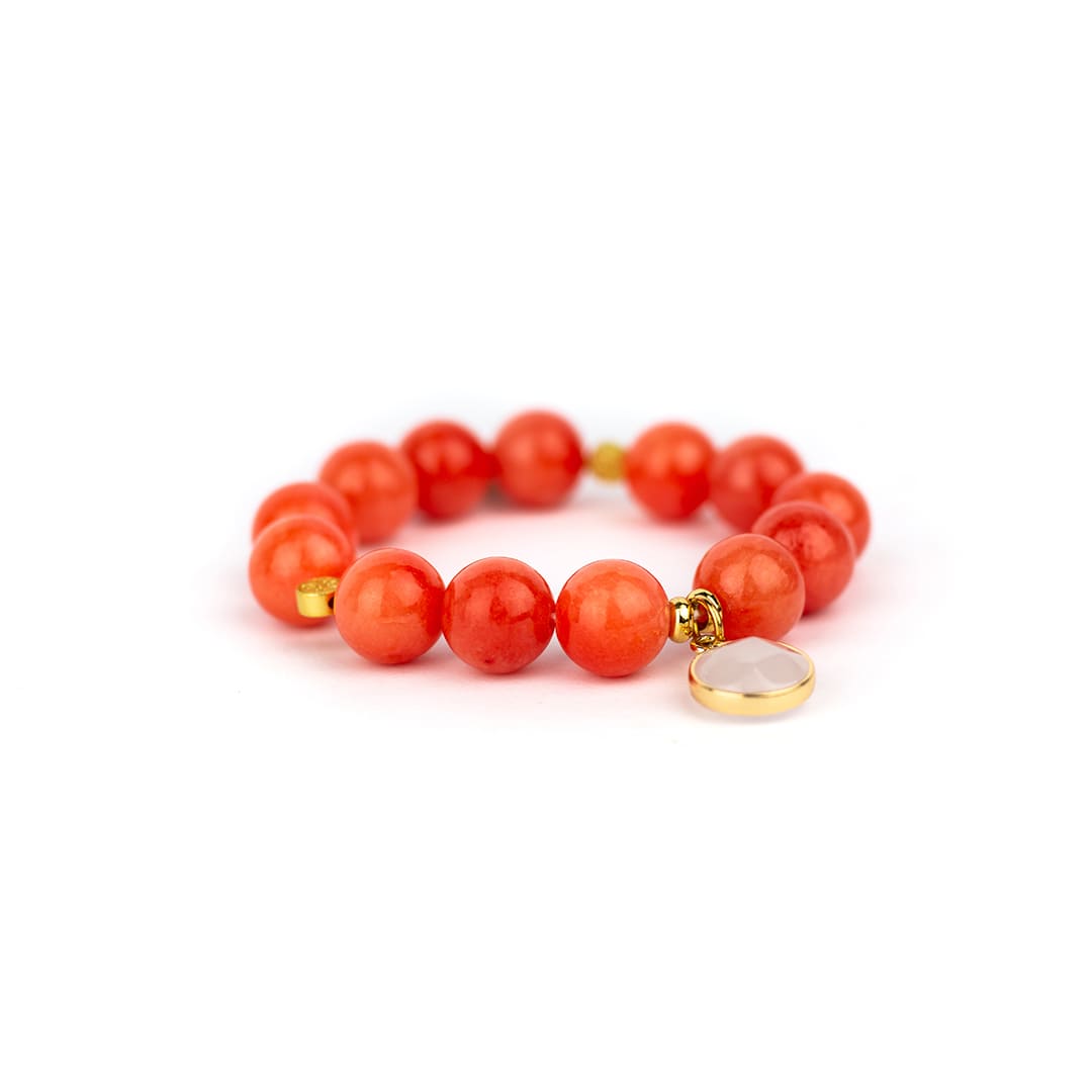 Unser Armband ‘Vega’ veredelt auf sehr lässige Art dein Outfit. Die Kugeln aus Jaspis reihen sich mit zarten Goldplättchen an ein Stretcharmband und schmiegen sich angenehm an dein Handgelenk. Ein facettierter Edelsteinanhänger sorgt für den WOW-Effekt.