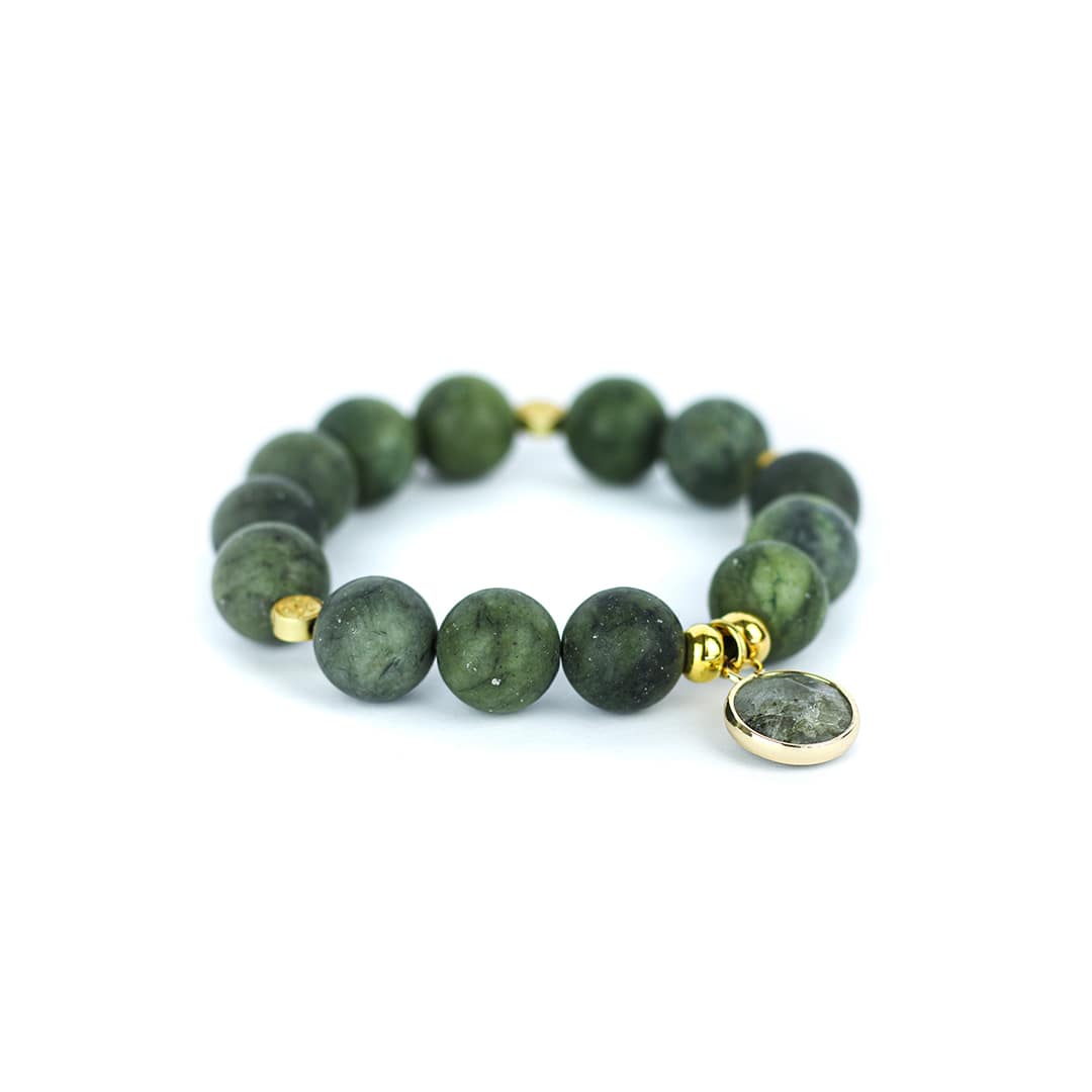Unser Armband ‘Vega’ veredelt auf sehr lässige Art dein Outfit. Die Kugeln aus verschiedenen Edelsteinen reihen sich mit zarten Goldplättchen an ein Stretcharmband und schmiegen sich angenehm an dein Handgelenk. Ein facettierter Edelsteinanhänger sorgt für den WOW-Effekt.