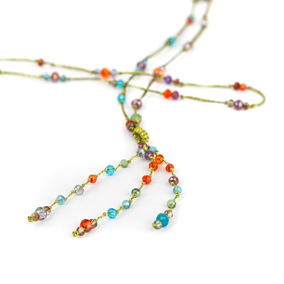 Dürfen wir vorstellen? Das ist ‚Indra‘, unsere farbig funkelnde Halskette an der sich zarte Kristalle an einer taupe- und goldfarbenen Schnur aufreihen. ‘Indra’ versprüht einfach nur gute Laune und begleitet dich je nach Styling im Urlaub, Alltag oder auch beim Feiern. Der Verschluss ermöglicht dir eine variable Längeneinstellung.