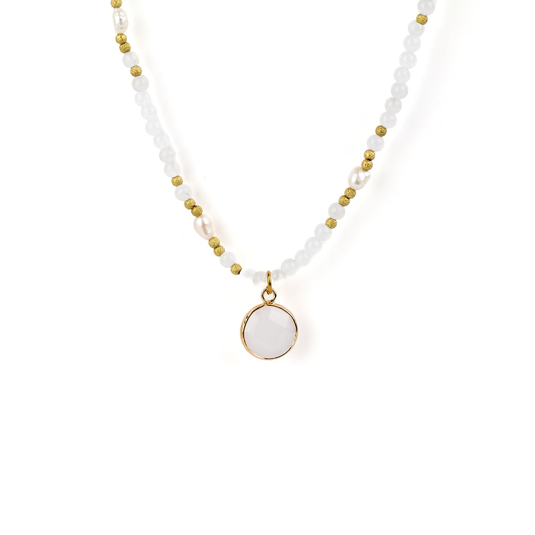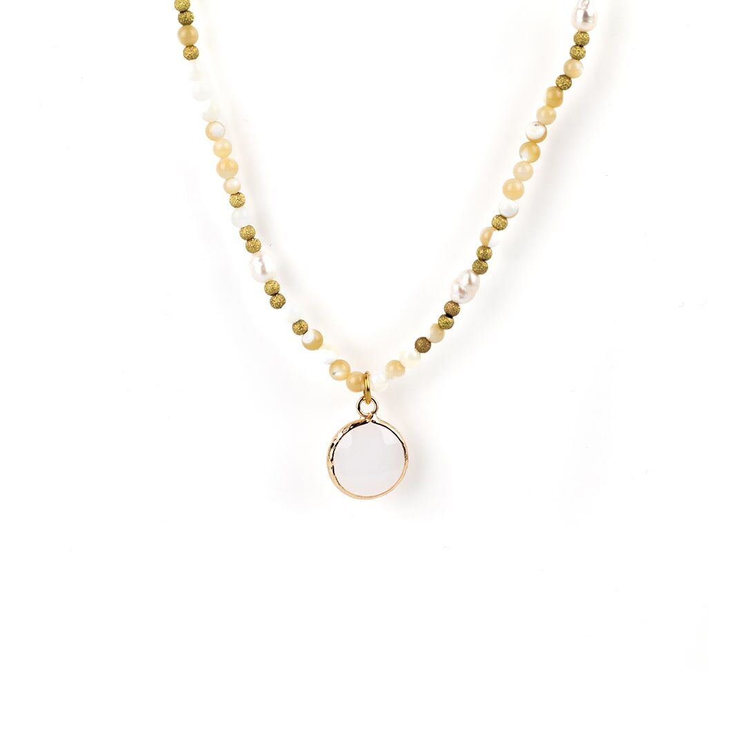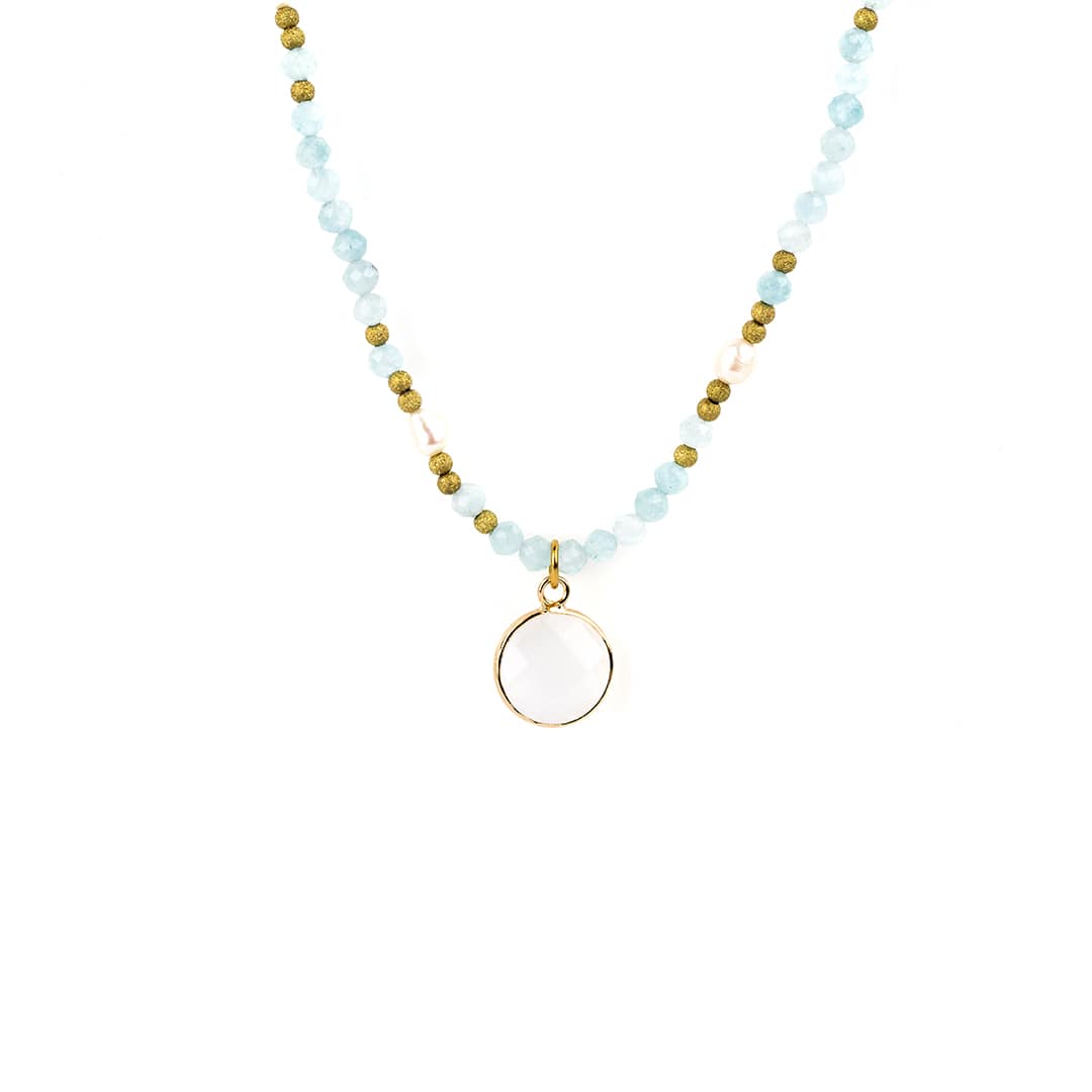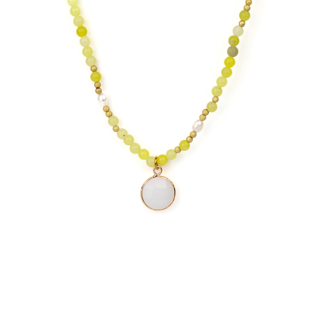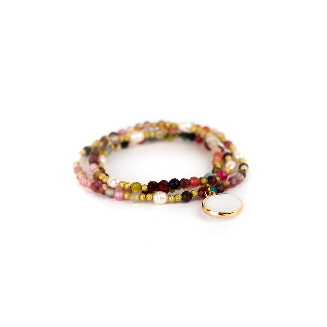 Farbig schimmernde Edelsteine mit feiner Facettierung reihen sich an unserer Kette ‘Ani’ mit zarten goldfarbenen Kügelchen und einzelnen Zuchtperlen aneinander – ein wirklich edles Ensemble, das durch einen in gold gefassten Edelstein ergänzt wird. Mit diesem Accessoire setzt du ein Statement, das jeden Look veredelt.