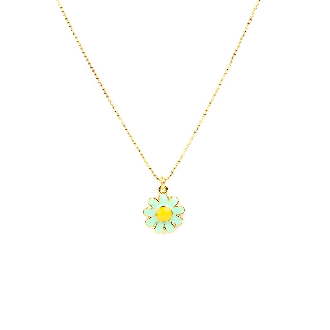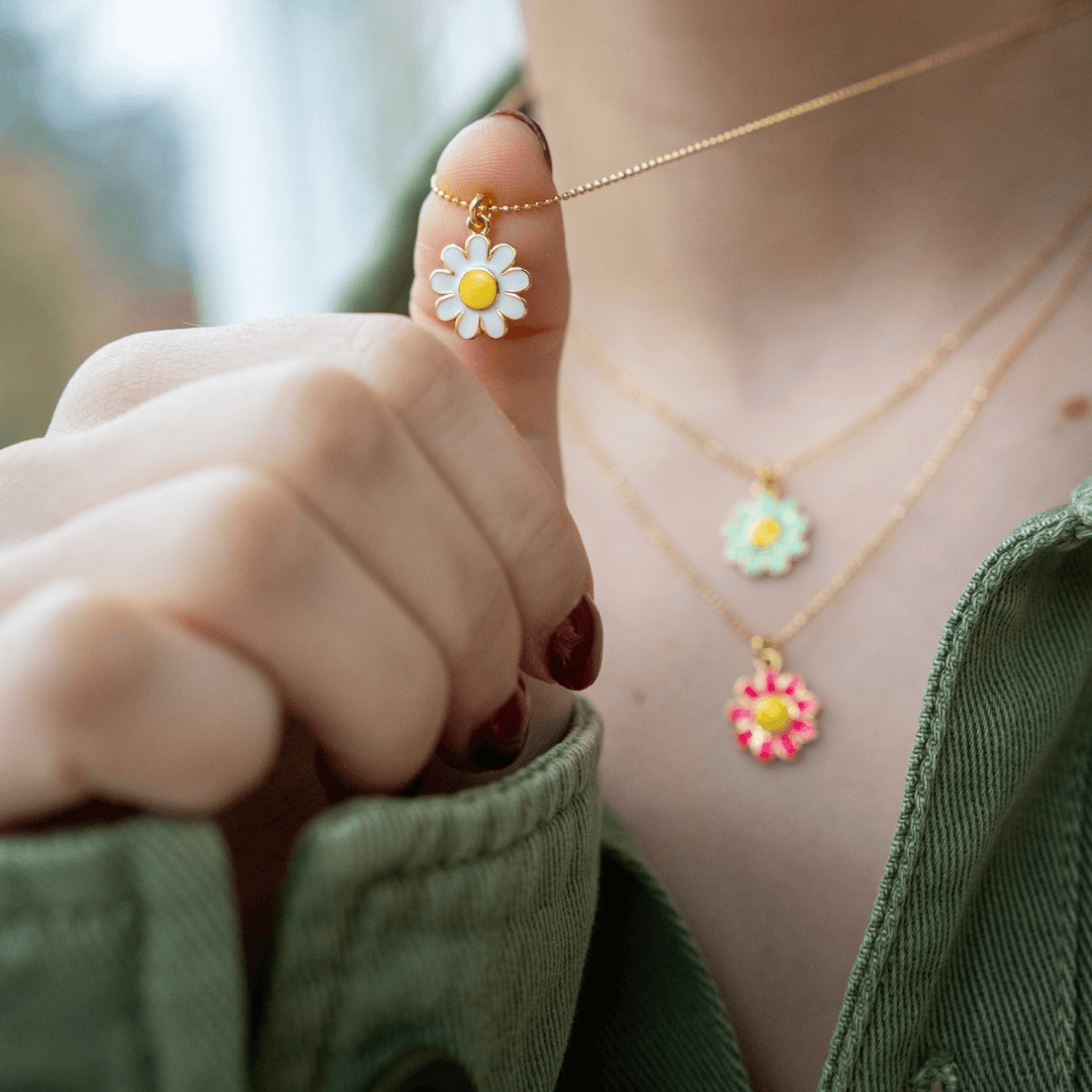An einer zuckersüßen aus kleinen Kügelchen bestehenden Kette aus 925er Sterlingsilber hängt eine zarte Blume in den Farben weiß, pink oder türkis.
