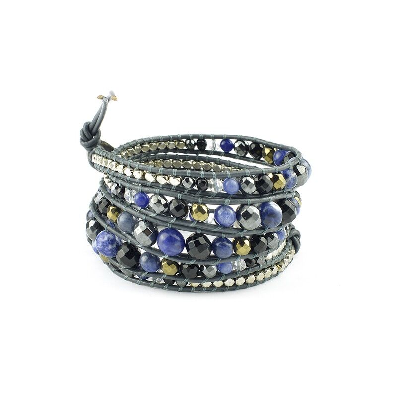 Fünffach um das Handgelenk gewickelt wird dieses lässige, graue, ca. 7 mm breite Lederarmband. Verschieden große, schwarz-blau-anthrazitfarbene Halbedelsteine wurden in Handarbeit an das geschmeidige Lederarmband geknüpft.